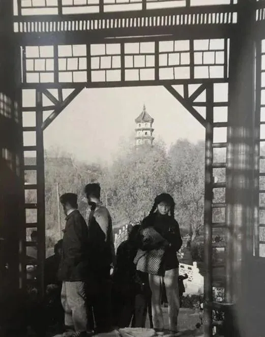 这个亭廊口子叫花格门,木头做的框子一格一格,光从缝里筛下来,在地上织成花样,远处那座层层往上叠的塔正好落在中间,像给人对了齐,姑娘抱着棉被站在边上,手上还攥着线头,冬天的太阳不辣,暖得人眯眼。