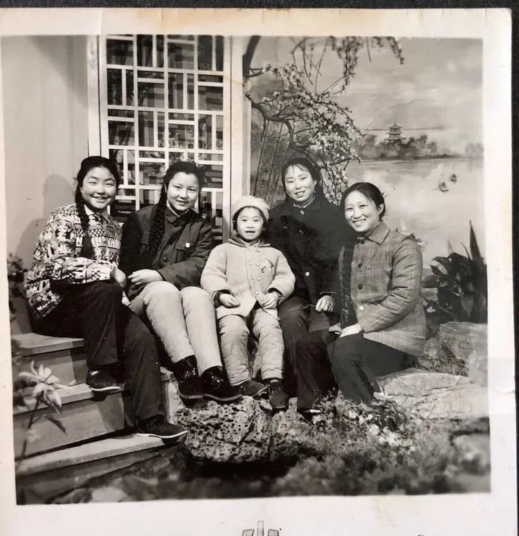 图中这张叫照相馆合影,背景是手绘山水布景,旁边摆假山石和花盆,五个人坐得端正,辫子粗黑,扣子一粒不少,最中间的小姑娘穿棉套装,袖口鼓鼓的,照相叔叔喊一二三别眨眼,她还憋着笑呢,那时拍一张要拿票或者攒好久钱,家里会把相片装进玻璃柜,逢年过节拿出来擦一擦,亮堂堂的。
