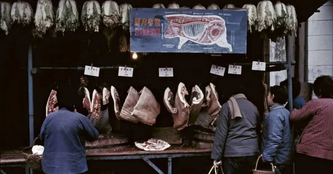 这个摊位叫鲜肉零售,顶上挂着一块分割示意图,前槽后腿写得清清楚楚,钩子上坠着一排肥瘦不一的肉段,算盘啪嗒一响,掌秤的师傅手腕一抖,铜秤砣挪到位就落刀,妈妈说过年能买到二两里脊,回家切丝炒青椒,香得把邻居小孩都勾过来闻一闻。