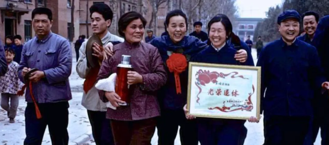 这面匾叫光荣集体,红绸花别在胸前,几位女同志笑得见牙不见眼,胳膊挽着胳膊往前走,旁边小伙抱着搪瓷暖壶,像护着个宝,爸爸说那阵子评先进是大事,回厂里要上台发言,发到的奖品用到坏才舍得换。