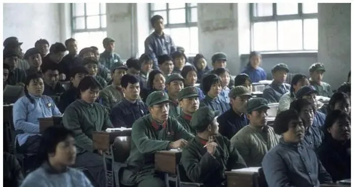 这个场景叫工农兵学员上课,军绿棉帽挤在一片里,木桌面被写字磨得发亮,老师站在过道提问,举手的同学往前探着身子,肩膀上还落着一粒粉笔灰,那时候书本紧缺,笔记本一行不浪费,字挤得细细密密。
