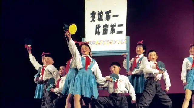 这阵势叫台上文艺汇演,小学生扎红领巾,举着拍子喊口号,标语牌上写着友谊第一,比赛第二,台下鼓掌的手拍得通红,我记得自己也上过台,拍子举得直抖,退场还差点走错口,笑死人。