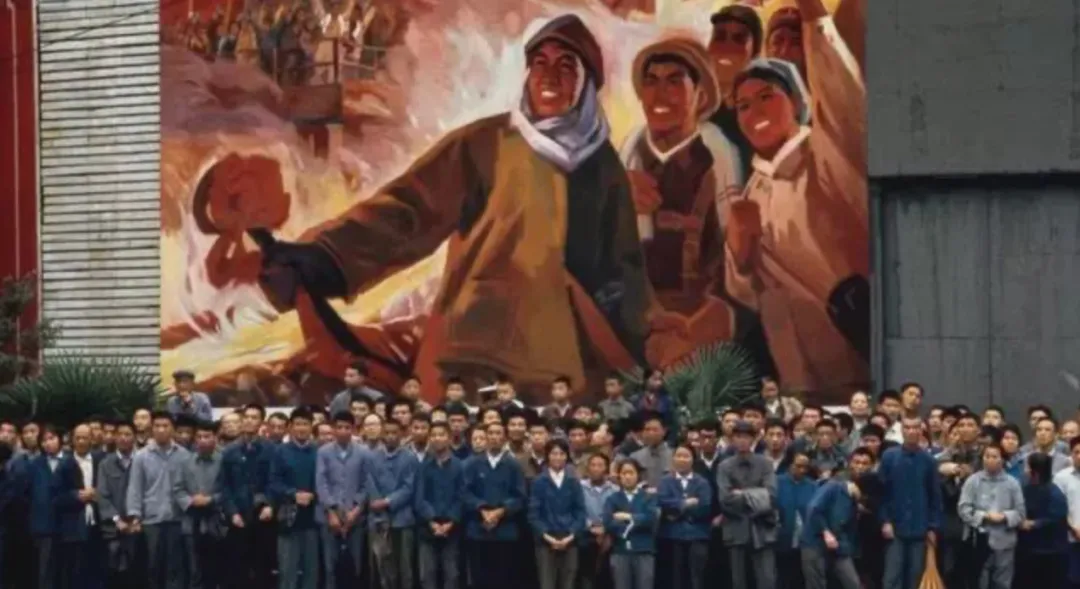 这堵墙叫宣传画背景,前头一大群工人合影,蓝色咔叽服一片,海报里火光腾起,袖章一抹红,镜头一按,年代味扑面而来,现在拍照随手一连串,那时一张足够传一代。