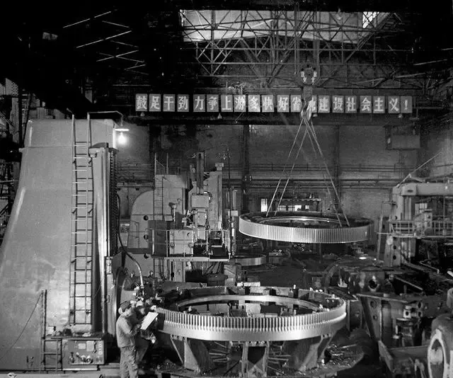 这个庞然大物叫立车和齿圈,吊车钢索拉得笔直,口号横幅悬在梁上,机床嗡嗡不停,工人戴着安全帽对照图纸,粉尘裹着机油味儿,爷爷说夜里也不停机,班组轮着上,人困了靠着立柱打个盹,醒来继续干。