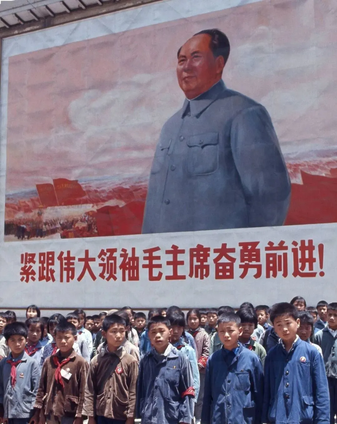 这块墙叫巨幅标语下集合,学生排成队,衣服补丁一层压一层,风把红领巾吹得斜斜的,摄影师站在对面蹲着取景,大家眯着眼看他抬手,咔嚓一声,胶卷里就有了那年的天光和脸庞。