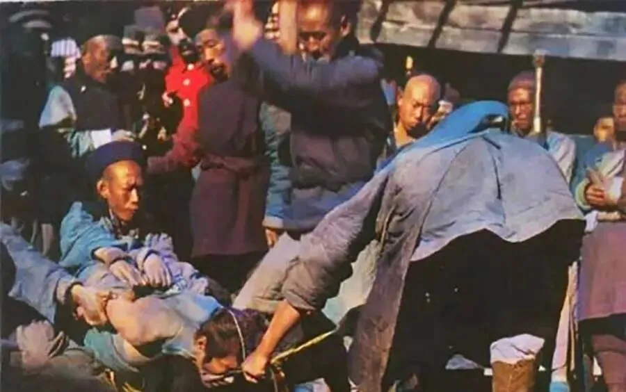图中这处场面叫菜市口行刑场,粗麻绳勒着人,秋阳一照,尘土飞得眼睛生疼,围观的人离得不远不近,有人伸长脖子看热闹,有人皱眉叹气,长衣短褂挤在一处,声音嘈杂像锅开了气,老辈人说,那时候的惩戒不讲遮掩,拿到街面上给人看,就是要“立威”,现在我们讲法度和程序,哪还容得这种场面上街晾晒。