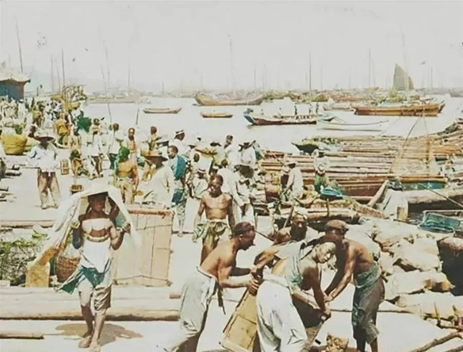 图中这块忙得团团转的地方是烟台码头,肩挑手抬,扁担把肩窝磨出老茧,汗从脊背直往下淌,船只一溜排在江面上,帆影密密的,领班吆喝一声“起”,几个人配合着把木箱一抡,踏实得很,我外公年轻时在河埠干过活,他说好肩要一口气走稳,抖一下就得返工,这门手艺全靠身上的劲和一口气,现在一台吊车几分钟就卸完一船,轻省是轻省了,力气活也跟着没了踪。