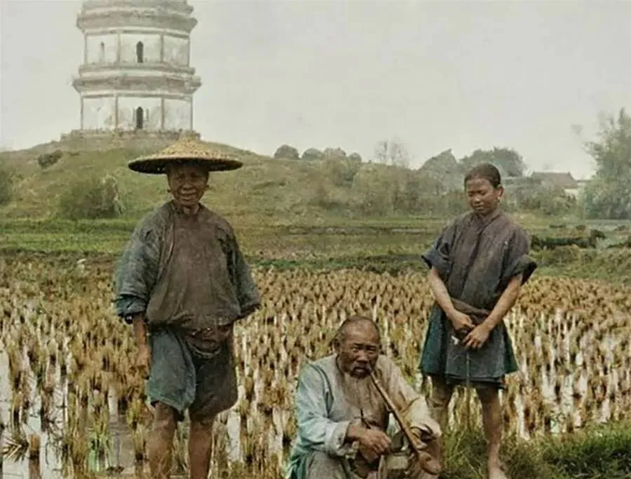这个三口人站着的地方是稻田边,老汉戴斗笠蹲在田埂抽旱烟,烟袋锅儿亮得发光,身后塔影被雾气一裹,像在梦里,脚下水田刚插过秧,秧尖嫩得能掐出汁,奶奶说,以前春忙时节人不够用,邻里之间互相搭把手,一碗咸菜一瓢米汤,干起活来照样带劲,现在机器一下田,轰隆隆一过,秧排得比线还直,可田埂上的话头少了,连吆喝都听不见了。
