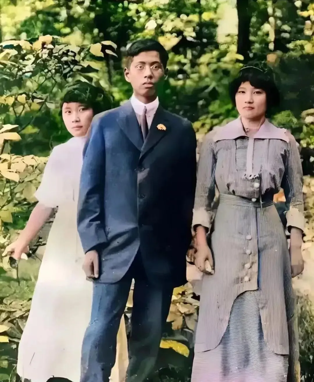 图中这张青年合影叫留学照也好求学照也行,西装笔挺的男生站中间,胸针一枚小小发亮,左右两位女孩裙摆利落,树荫里光斑一片,面孔认真得很,那个年代拍照少见笑,让人一看就知道这是件正经事。