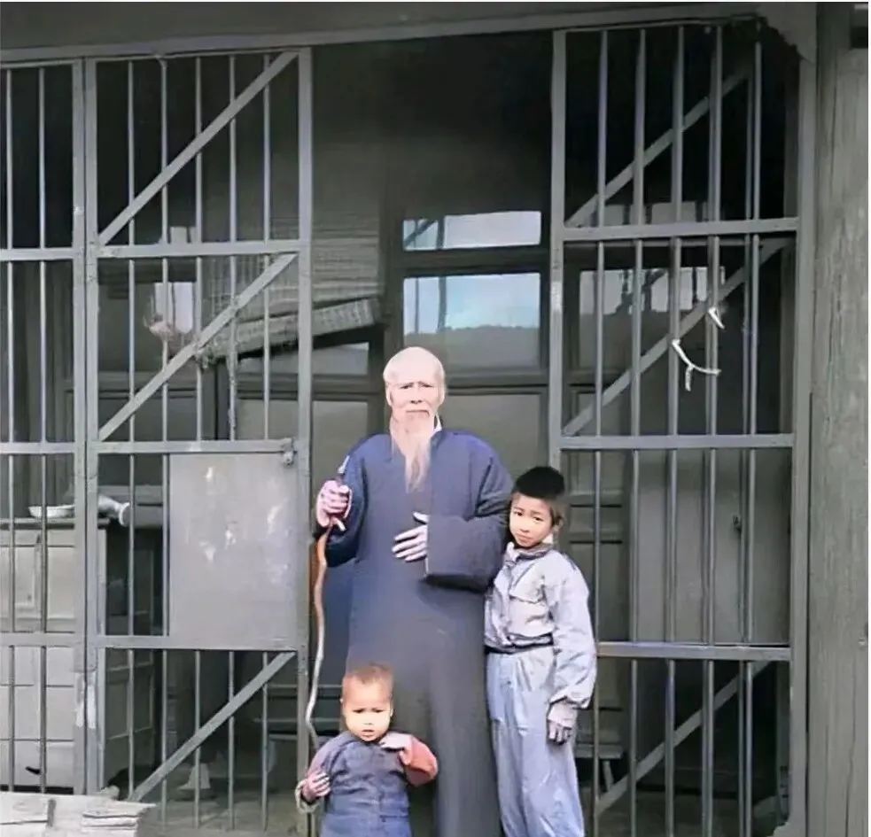 这个场景叫宅门口的家族影,木栅门高高立着,老人拄着蛇头拐杖,胡子垂胸,两个小娃紧靠着,衣裳洗得发白,背景里窗棂和帘子都是真实的日子,奶奶看见这张会嘀咕一句,过去拍一张得换上最好的一身,现在小孩手机里一天能拍一百张。