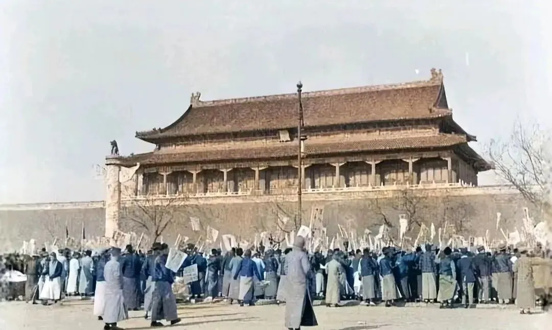 这个大场面叫城门前的集会照,横幅旗子一阵一阵地晃,棉布长袍挤成一片,城楼上还蹲着个看热闹的,口号写得大大的,场子里脚步声和喊声搅在一起,历史拐弯的回音就这么被定住了。