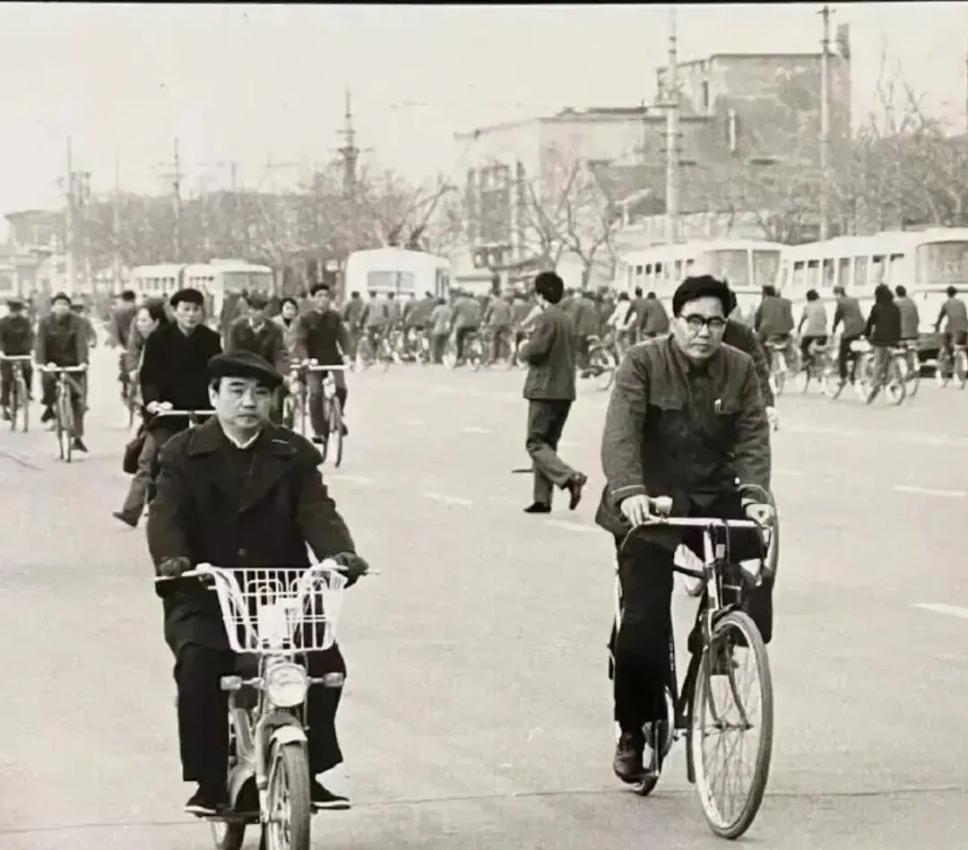 这一幕太熟了,自行车海,前排一位戴鸭舌帽的叔骑着带篮子的,旁边哥们儿穿着呢子外套,口袋里别着钢笔,整条路被车铃声串起来,过去上班靠腿,现在地铁咔嚓两站,脚底板都懒得热一热。
