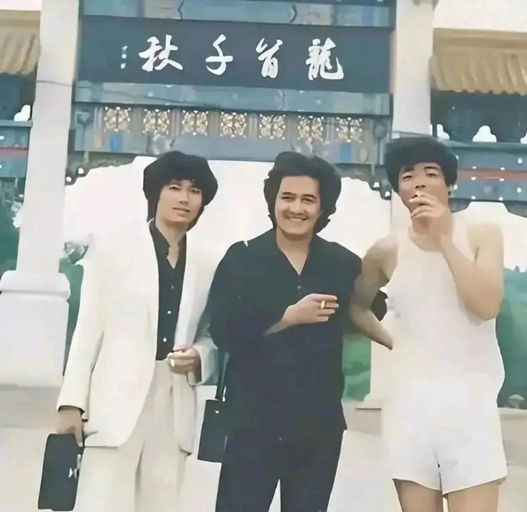 这三位的打扮可带劲,白西装配喇叭裤,黑衬衫里压着笑,右边这位穿着背心短裤就上阵了,手里夹根烟,牌坊上四个大字一落,画面味道就出来了,八十年代的风从他们头发缝里穿过去,留下一点不服输的潇洒。
