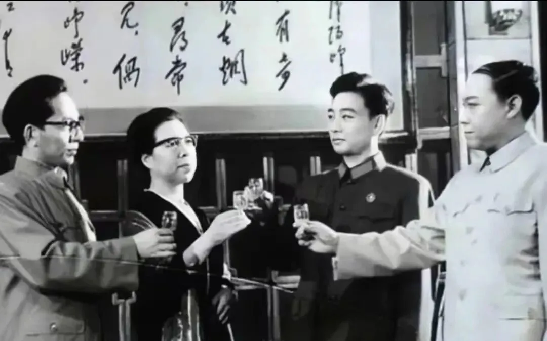 这张叫举杯照,四个人抬手相对,玻璃小杯里清亮,背后挂着字,刚劲有骨,眼神里是把事儿说定了的笃定,话不用长,碰一声就是承诺,那种分寸感,是如今自拍里学不来的。