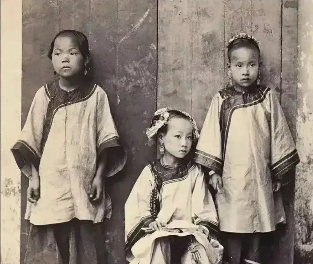 这幅是清末小女照,中间的小姑娘裹着小脚,发饰堆得细碎,衣摆刺绣一层一层的,左右两位站着的更朴素,耳垂上各坠着个圈儿,身份的差别在衣角的纹路上就能看出来,奶奶说,幸亏后来风往前吹,姑娘们终于能把脚迈开路。