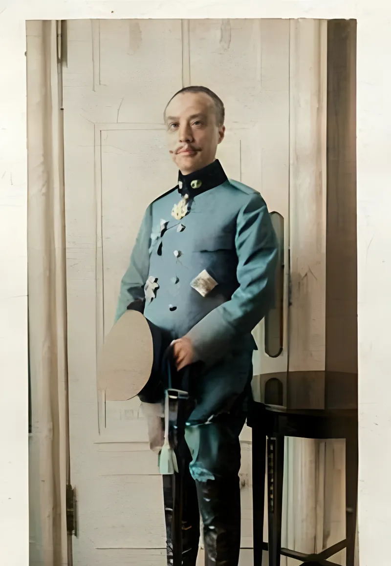 这个角度看更清楚,军装肩章发亮,剑柄竖在手边,胡子修得挑起一点,小得意里带点疲态,站在木门前,光影把人衬得更瘦了,时代就是这样,台前台后换得飞快,前一天还在谈军制,后一天就成了报上的讣告。