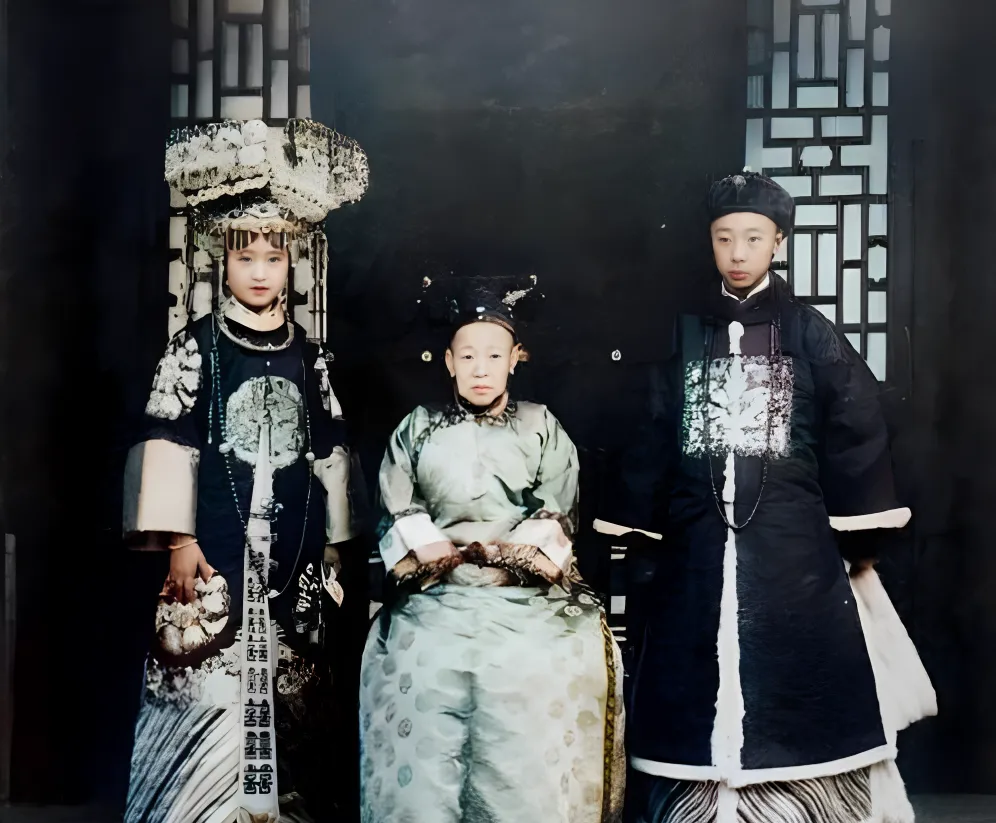 这张合影中间坐着的该是位长辈,左右两边的华服装饰高高耸着,垂珠顺着面颊往下落,站姿笔挺,背景是几何格的屏风,冷冷的光从缝里透进来,场面看着富丽,实际各有各的心事,旧礼法把人裹得严严的,笑也收着,连衣袖都不敢随便摆。