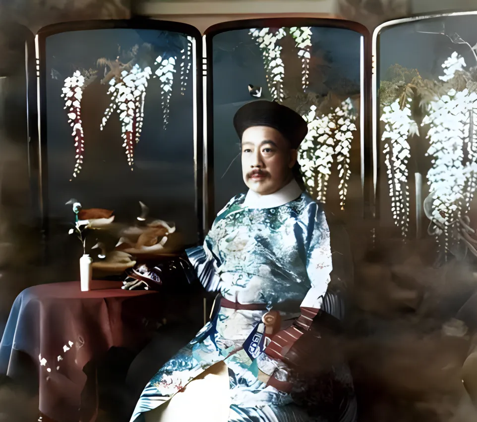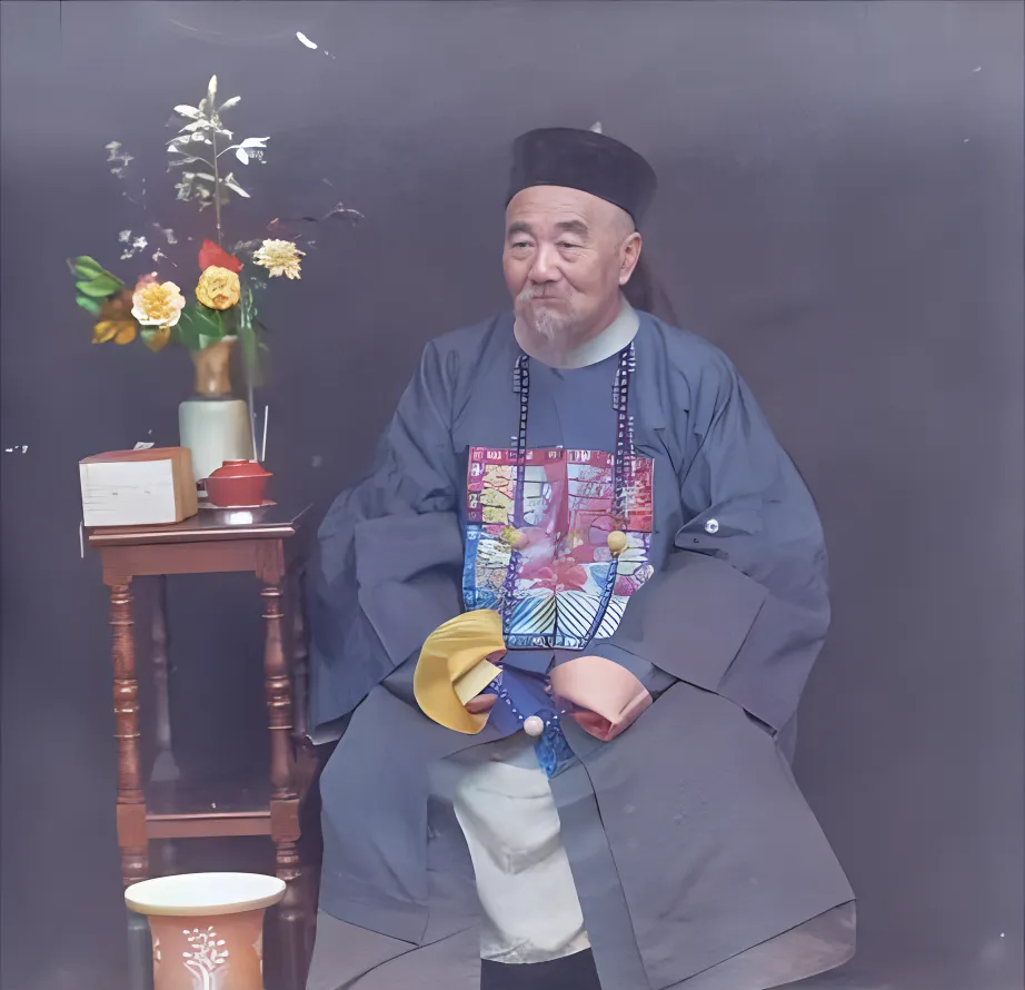这位长者的补服上绣着海水江崖,胸口一方补子色彩鲜活,手里捏着折扇,须眉修得干净,桌上一盆花,几朵开得正好,他的履历要细翻能翻出一大串,做过哪府哪道的官,调过哪省哪镇的差,照片里却只剩下沉下来的人情世故,像熬过风浪后的温水。