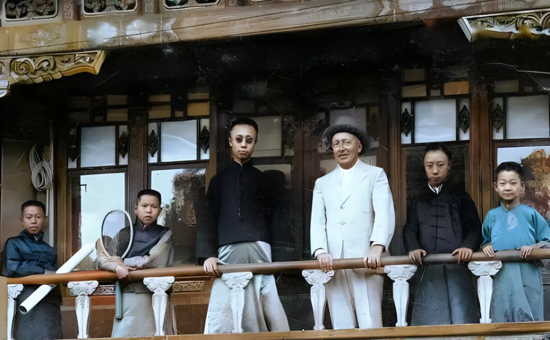 这张栏杆上的合影里,左边的小太监抱着球筒,另一个拎着球拍,中间那位戴着圆墨镜的正站在风口上,右边的洋先生穿白西装笑得很开,旁边几位年轻人靠着栏杆,衣摆被风掀起一点点,这就是传说里的御花园打球后随拍,以前皇城里也有闲趣,现在看起来更像放学后的男孩们,轻轻松松站一排。