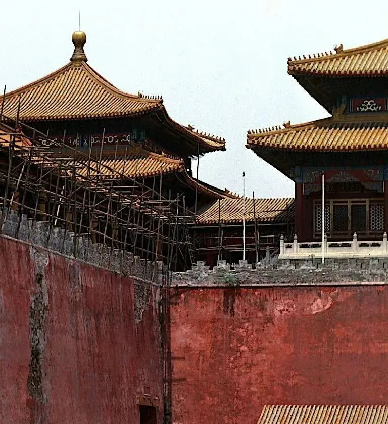 图中这些细竹竿搭的叫脚手架,抱着红墙沿线往上爬,木匠把榫卯合上敲两下,灰瓦像鱼鳞一样一片片码整齐,远看金顶在日头下发光,父亲说“修一次能管好多年”,我们只顾抬头看,不敢出声。