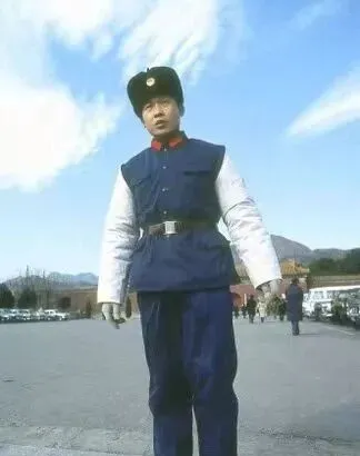 这个蓝棉制服叫执勤大衣,腰间勒着黑皮带,袖管里塞棉花,风一来整个人像口袋一样鼓起来,小伙子声音不高,手却利索,指给你哪边进哪边出,礼貌得很。