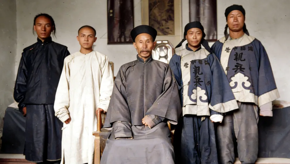 图中这身短打和袖口滚边的叫亲兵甲衣,面料多是粗布或厚棉,胸口一块白底黑字的**“亲军”**牌样最扎眼,旁边的长袍马褂颜色发暗,袖口被汗油磨得亮,坐中间那位副将戴瓜皮帽,帽檐压得稳,手背筋络清楚,边上两位身上短衣外罩像披挂似的罩甲,站姿直,眼神更直,屋里墙面空空,椅背雕花却一点不张扬,像是官里借来摆相的道具。