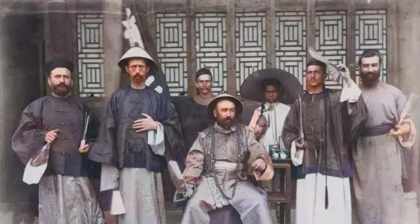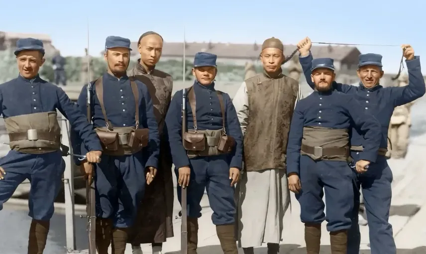 图里这排蓝灰军服的是法兵的行头,立领、肩带、皮制腰包一套一套的,旁边两位清人穿长衫马褂,个头出奇地拔,脚下却是薄底布鞋,法兵脚上是粗皮钉底,站在石台边上,阳光把军服的褶子打得利索,有人举着细线当笑料,脸上揶揄的味道在镜头底下收不住。