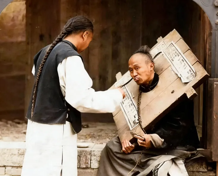 这块方形的叫木枷,厚木板两片合在脖颈上,边角用铁夹加固,前面贴着告示纸,字被风雨糊成一团,囚徒身子不由往前趴,腿搭成个二郎,嘴里嚼得急,旁边的男人手捏着食团递过去,辫子垂到腰后,影子压在台阶上,抬头那一剜带了点倔劲,像是在跟镜头顶牛。