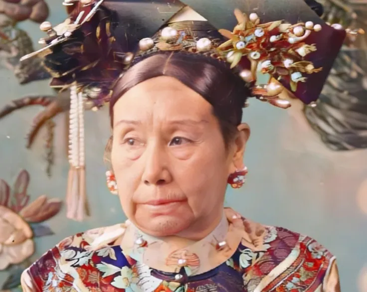 这个头上满当当的叫旗头钿饰,串珠、点翠、花簪挨挨挤挤一片亮,脸上的细纹不躲镜头,眼袋往下坠,眼神却挑得很利,衣襟上的绣样密,海水江崖、团寿暗着光,耳坠子沉,脖颈处的扣子扣得紧,离相机近了,妆面就藏不住,像街口坐在门槛上的老太太,又偏不是,权力的影子在她的下颌线那一搭就看见了。