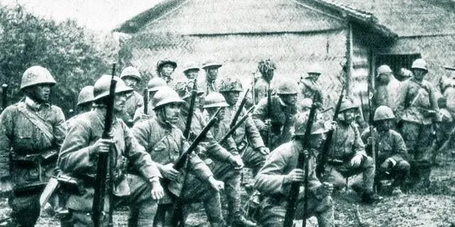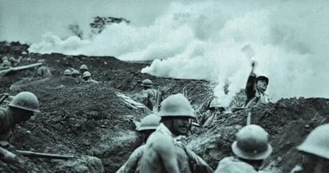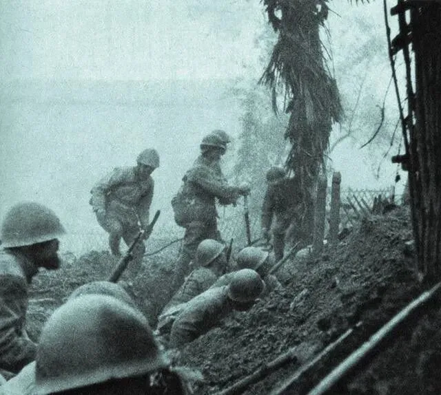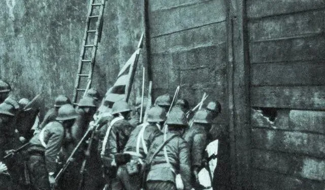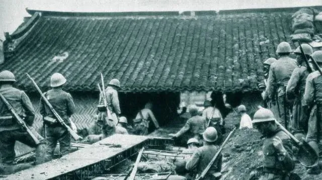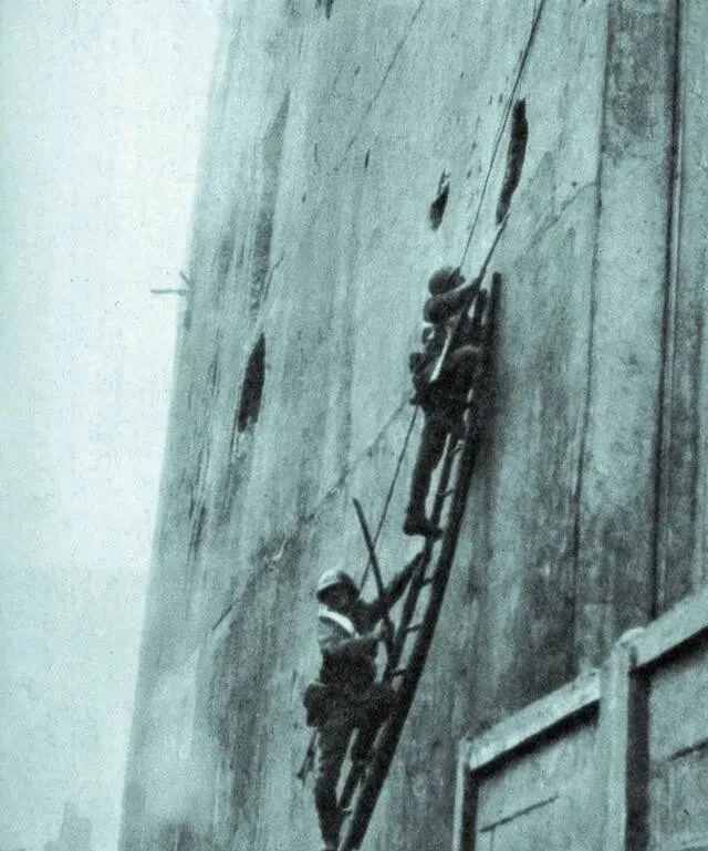 图中这道高墙边的冲锋叫强攻点门,木梯斜搭着,士兵扎堆往前挤,手里端着步枪和爆破筒,镜头看着吓人,其实这正是守军占便宜的地形,四行仓库是钢筋混凝土的大块头,墙面直上直下,进攻方只能挤成一条线往上爬,机枪口一开,火力像梳子一样扫过去,攻的人多不起来,伤亡就容易集中到对面去了。