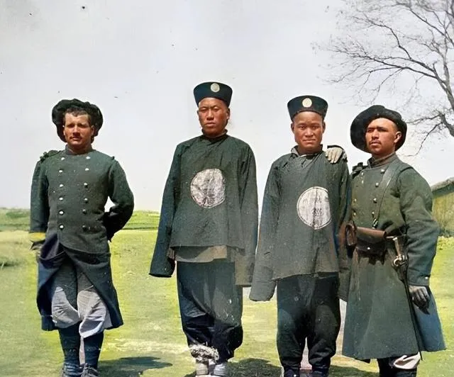 图里这身军装叫巡防装,厚呢料的深色大褂扣子成排,帽子是圆沿子上面一小块硬片,左边那位是外兵,腰间皮带别着枪套,站在野地里风一吹衣角发鼓,我爷爷看了乐,说那会儿咱们个子不吃亏,吃亏在器械和操法,走路都得按鼓点排成线,现在部队穿得轻利,动作也快,不再用这笨重的摆拍式精神。