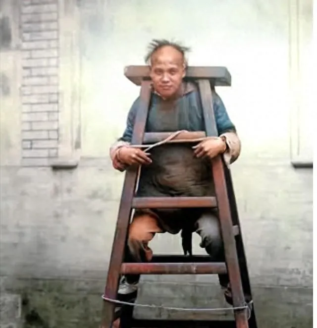 这个木家伙叫三脚夹枷,厚木梁子做成梯子样,中间穿人,肩脖子被卡住,手臂伸不直也缩不回,脚底还用绳勒着,别说走路,挪一小步都要喘一下,墙根阴凉地里看着发涩,当时衙门口用它示众,奶奶说远远看见这种刑具就绕道走,知道那滋味不轻。