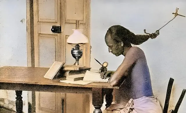 这个动作叫头悬梁,辫子被绳子勾住,人趴在桌上写字,旁边一盏洋油灯,灯罩白净,桌面只留书和尺,静得只听到笔尖刮纸的声,我小时候背书背到犯困,姥爷就指这张照说看人用的狠劲,不是给你学样,是让你知道老法子逼人也伤身,现在讲科学用眼,别真学。