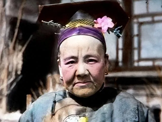 图中这顶是满族女式礼冠,四方硬沿子,边上插花,里层紫缎,脸上扑粉,衣服胸口绣着团寿,表情稳住了不笑,耳畔的坠子垂到颈边,奶奶说这种头面可沉,一戴半天脖子酸,现在婚礼也借来戴一回,走两步就想摘,别说忙前忙后。
