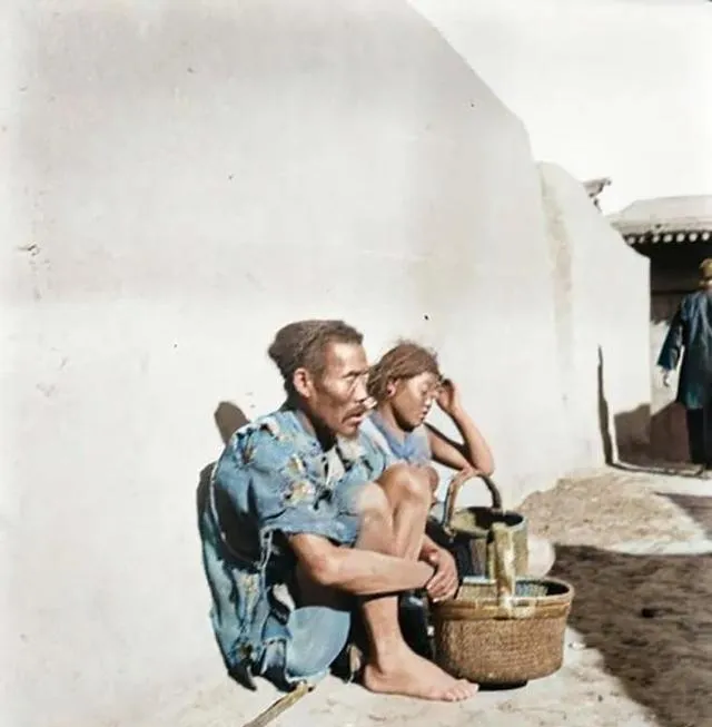 这对父子模样的人在墙根打盹,衣服破得见线头,篮子里是空碗,阳光晒得眼睛睁不开,行脚人从远处绕过去,往篮里撂两枚小钱,谁都没多话,那时候穷得直白,现在翻出这张照,心里还是一紧,知道那是真日子留下的褶皱。