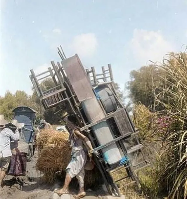 这个行当叫背夫,木架子像一面墙,桌椅柜桶全捆上,人往前一探身,绳子勒进肩窝,步子得又稳又慢,走到坡口要先停一口气再迈,我爸说他年轻时候在城里见过,远远看一座会走的小木楼,现在一辆货车两分钟装好卸好,体力活交给机器,想想也替那背夫松口气。