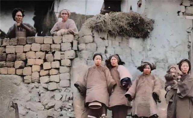 这张是乡下合影,粗坯砖垒起半堵墙,几位妇人站在风口,衣裳臃,袖口宽,身后草垛压得紧,表情被风吹得发僵,谁也不抢镜头,拍完就散,镜头抖一点也不讲究,反倒贴近当时的粗粝。