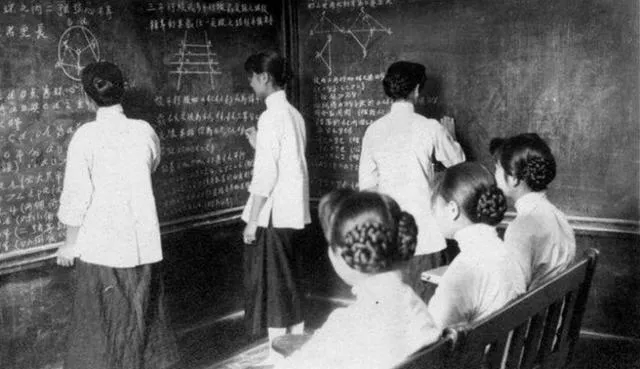 这个课堂叫女校的几何课,黑板上写满了平行线和角度,背后坐着同学抄得飞快,前排几位站着演算,衣襟收得整洁,老师没有出镜,粉尘在阳光里一丝丝往下落,奶奶说她那年也学过算盘和几何,可惜家里忙她没念完,现在女孩读书理所当然,当时能进学堂已经稀罕。