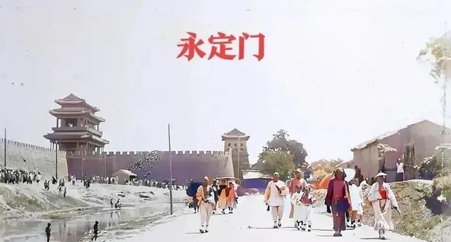 这张是永定门外,地面新修的土路延到护城河,行人散散落落,城楼在阳光下发白,边上小摊支着伞,风把伞沿吹得抖,照片上空留了大块天,像给过去留呼吸,现在站在同地儿,四下高楼林立,眼睛找不到这份空旷。