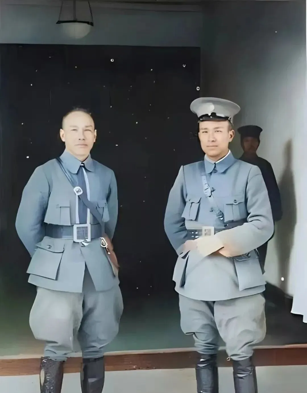 这个军服场景叫北伐军装照,呢料泛着灰蓝,胸前口袋分成几层,皮带扣有棱角,长筒皮靴擦得发亮,手背在身后,肩章利落,帽檐压低了眉眼。爷爷说,这身行头最讲究的是挺,站直了才配得上肩上的责任,那会儿上阵前把衣角抻平,别一个扣子都当成规矩,现在咱们穿羽绒服追求舒服,可人还是得有根骨头。