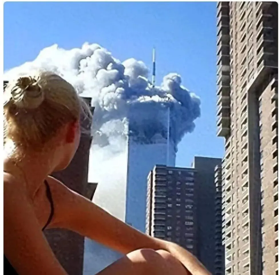 这张叫回望双塔,女孩把头发绾成一个小髻,肩线被日光抹得发亮,远处的楼像一支一支铅笔立在纸上,天边的烟云翻滚着,像棉被被人拽住一角。那天的新闻我是在食堂电视上看的,碗里是热汤,手里是勺,画面却凉得透骨,以前我们总觉得世界离得远,现在一声巨响,谁都得抬头。有些历史就那样闯进来,不问你准备好了没有,这一回头,成了永远的定格。