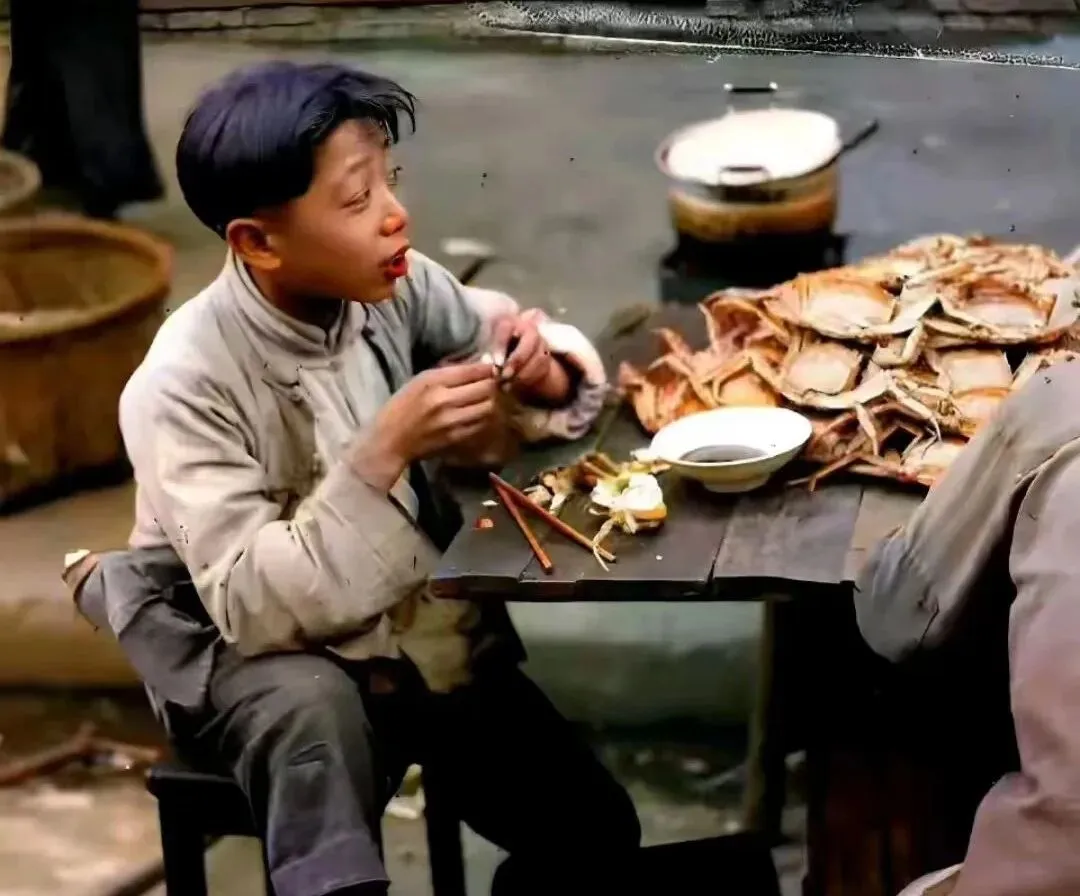 最后这张叫大闸蟹与小子,木桌边沿起了毛刺,酱碟在一旁亮着,小伙子一只手剥,一只手拈,一嘴油汪汪的,旁边的人影只留下半个袖口,桌上堆起的小山头是壳也是日子。外公笑我,说以前哪舍得顿顿荤腥,青黄不接的年月,能捞到两只就是过节,现在外卖点一点就来,壳倒是堆得更高了,味道却未必更香。日子是条河,涨了退了,岸边的人换了一茬又一茬,可一张旧照片翻出来,馋劲和人情味就都回来了。
