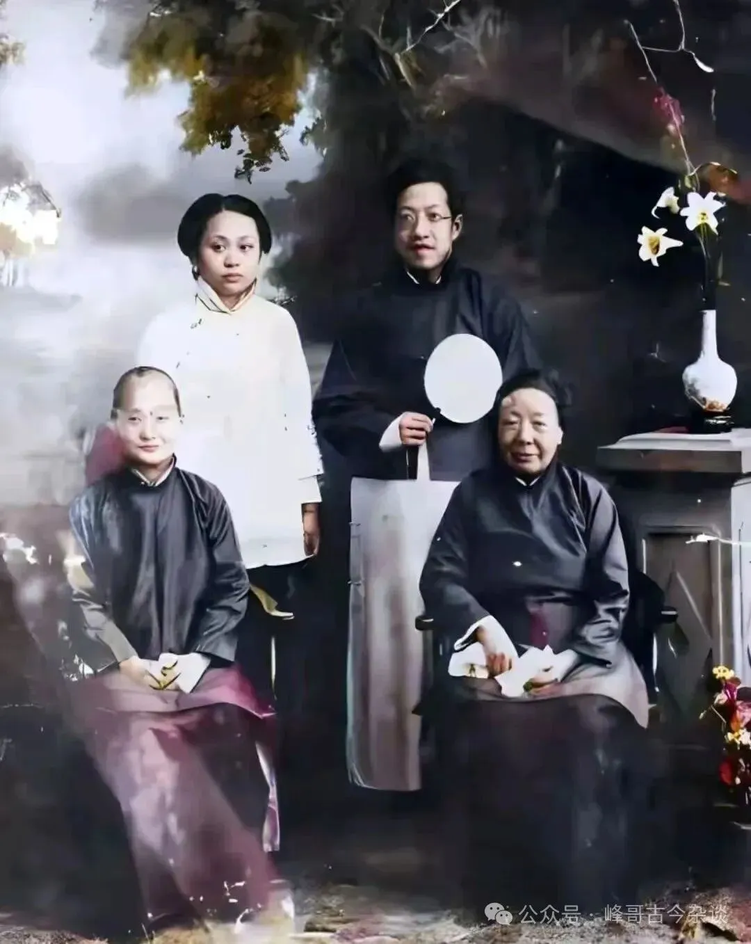 1914年,章太炎先生与夫人汤国梨,以及汤国梨的两位母亲——沈太夫人与邹太夫人一起合影。章太炎,清末民初民主革命家,思想家,学者,主要研究小学,历史,哲学,政治,朴学(考据学)等,著作丰厚,被称为“国学大师”。