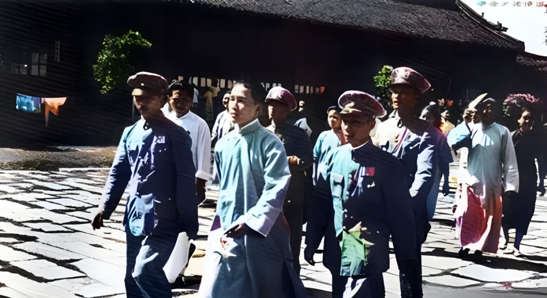 图中这位青年穿着素色长衫外罩对襟褂子,脚下青石板被阳光照得发白,旁边押解的军警帽檐硬挺,袖口别着纸条,老照片里常见的编号标识,奶奶说那会儿街巷一静就能听见脚步声回响,法庭不是戏台,走进去的人心里都打鼓,这张脸上看不出喜怒,倒有一股绷着的劲儿,旁观的百姓挤在阴影里,衣摆被风一撩,像在窃窃议论。