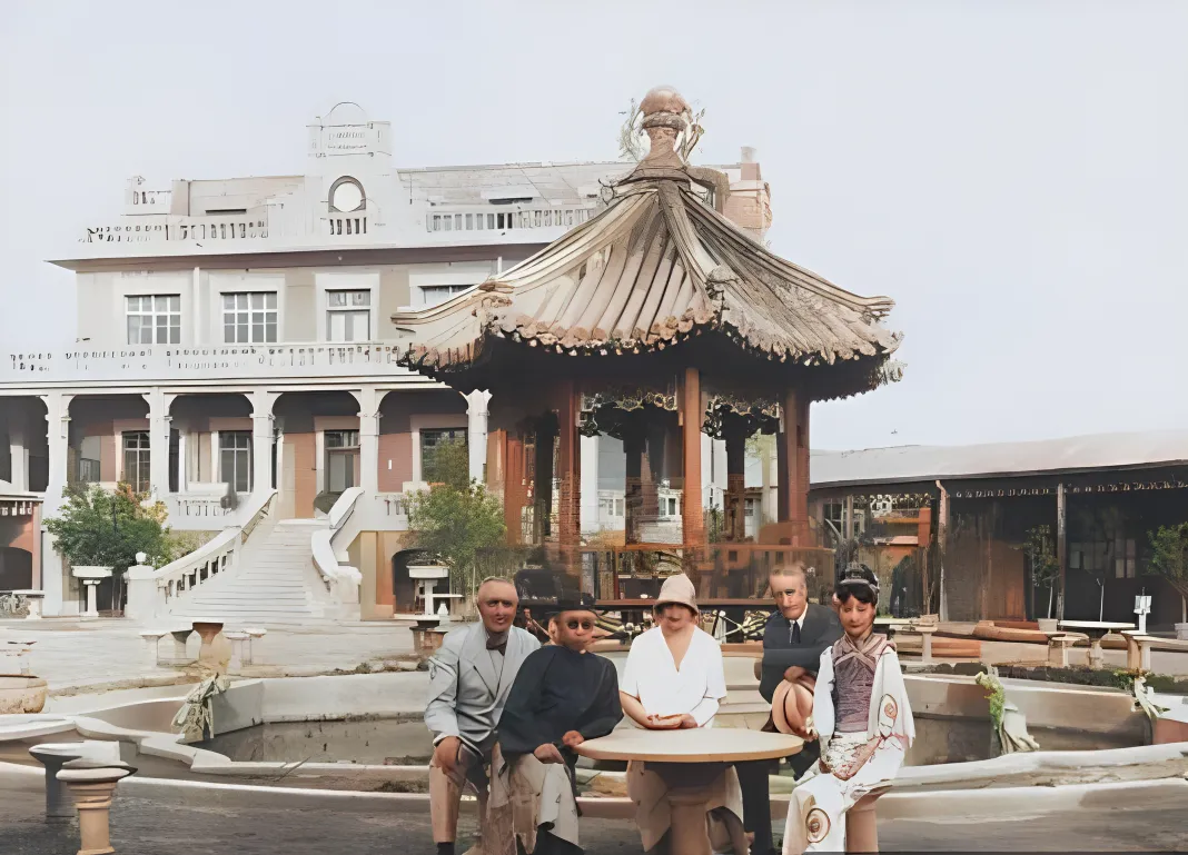 这个庭院叫张园,西式立柱托着回廊,正中一座中式八角亭,瓦面起翘,桌几圆而厚,几位男女围坐,衣料有绸有呢,颜色淡到像被太阳洗过,我外公看了说那会儿人讲究坐相,手要收住,脚跟并齐,楼梯旋下去的那道弯像是在暗示转场,历史也确实在拐弯。