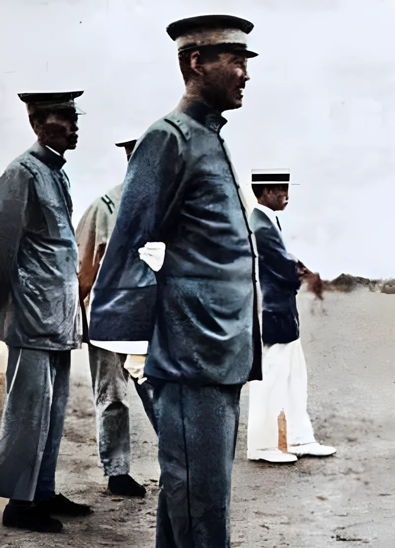 图中披大氅的军人站在队伍中央,皮带勒得直直的,军帽檐子压得低,旁边参随挎着望远镜,手里夹着文件夹,地上细碎的光点一闪一闪,像火线上的砂砾,爷爷说打仗时最怕的不是枪响,是等命令的那几分钟,心悬在嗓子眼儿里,谁都不敢喘大气。