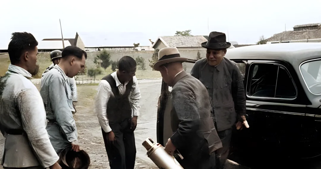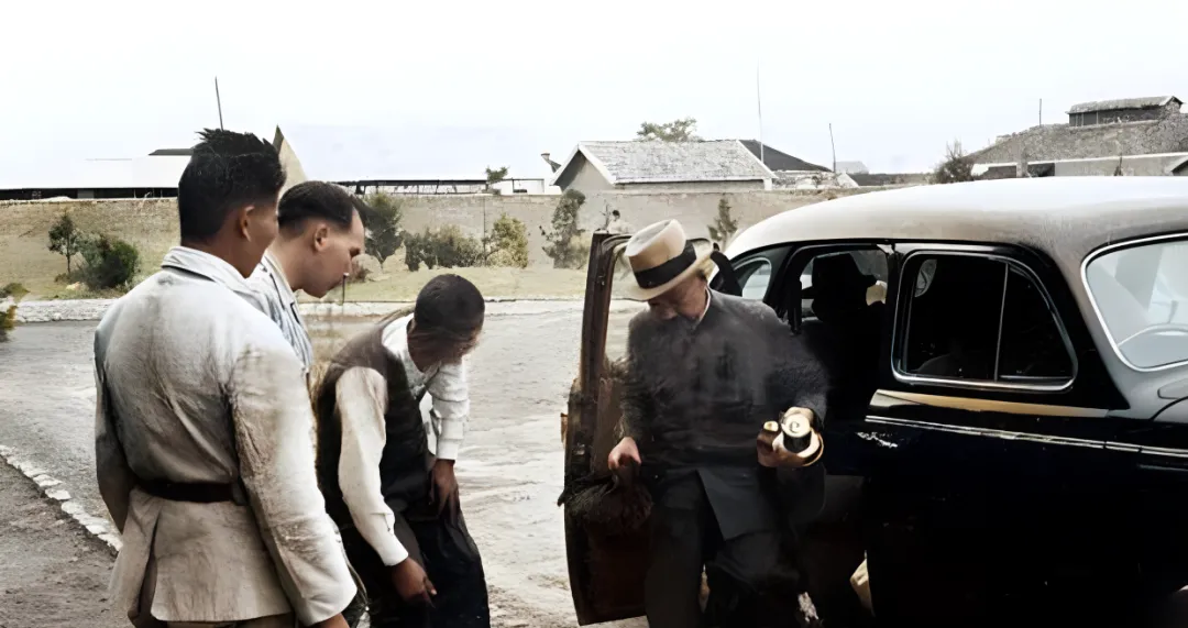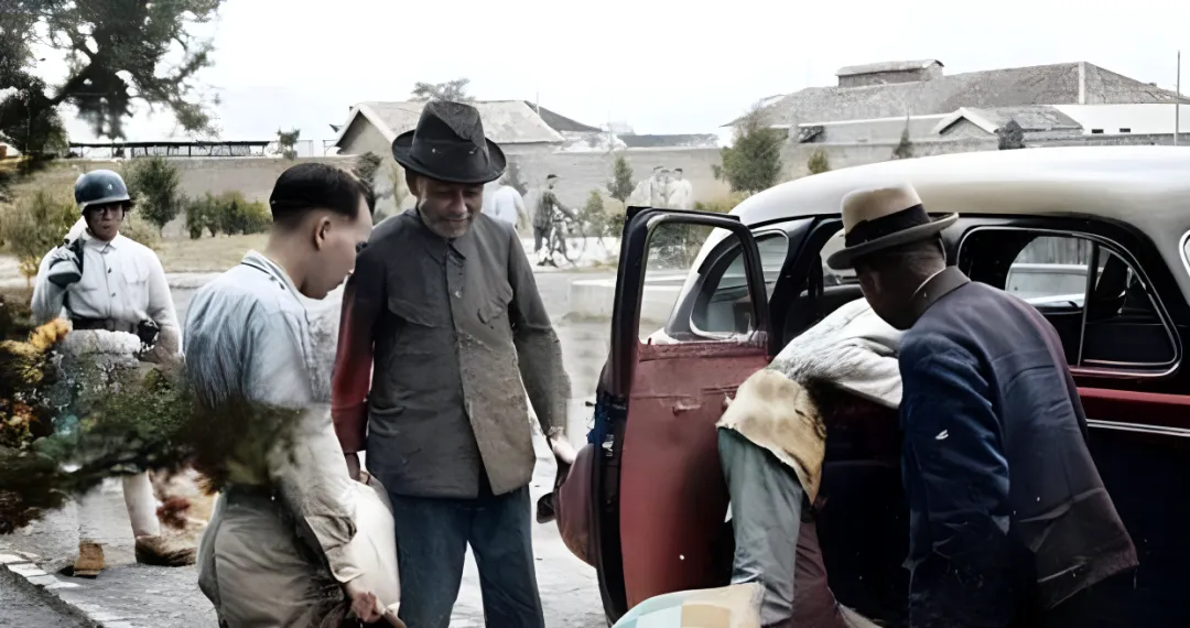 这辆黑色的轿车车门敞开,边上人提着圆口热水瓶,盖子亮成一个小光点,帽檐斜着压住半边脸,押解的士兵站在一旁,肩章反光,地面有细碎的石子路纹,爸爸看见热水瓶笑了一声说那玩意儿保温不错,我们小时候出门也带,区别是心情轻松得多。