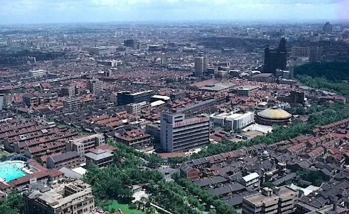 图中这一大片红瓦灰墙叫里弄与旧街区的屋海,屋脊像鱼鳞一样一层压一层,砖墙被风雨磨得发亮,间或冒出几栋新盖的水泥楼,像刚冒头的家伙,显摆得很呢,爷爷说那会儿抬头一看全是瓦片的波浪,现在一看全是玻璃的海,变得可快了。