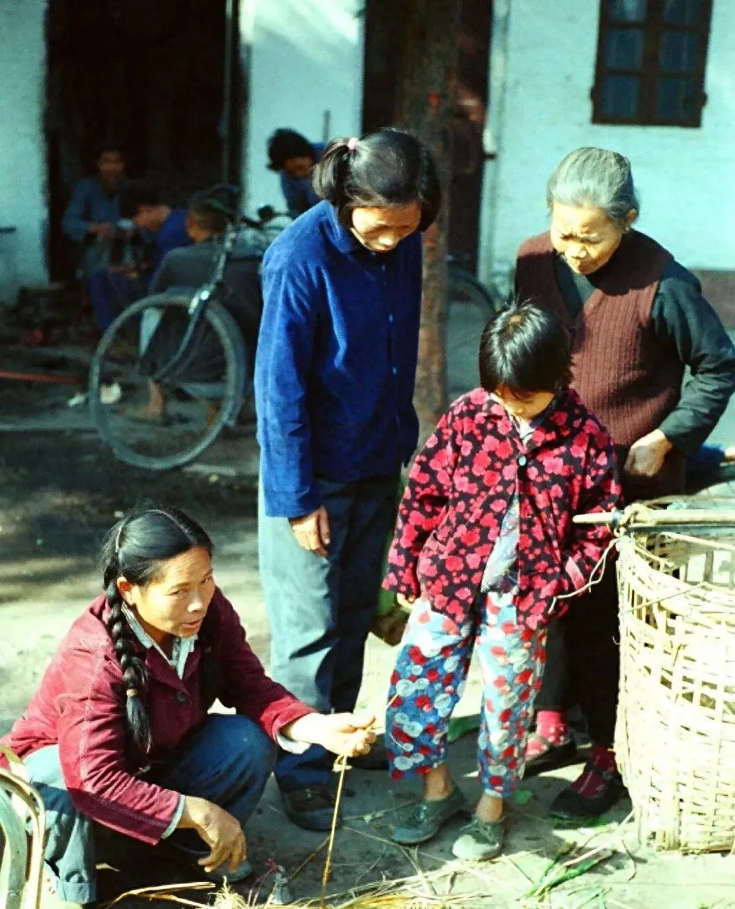 这张里手上那把细黄的叫竹篾,一根根掰开,抿着口水顺一顺,交叉一压,篓子底儿就出来了,旁边孩子把头伸得老长,奶奶笑说别扎着手,等编好了提去赶集,装菜装蛋都稳当,后来塑料筐一来,竹篾味儿就淡了。