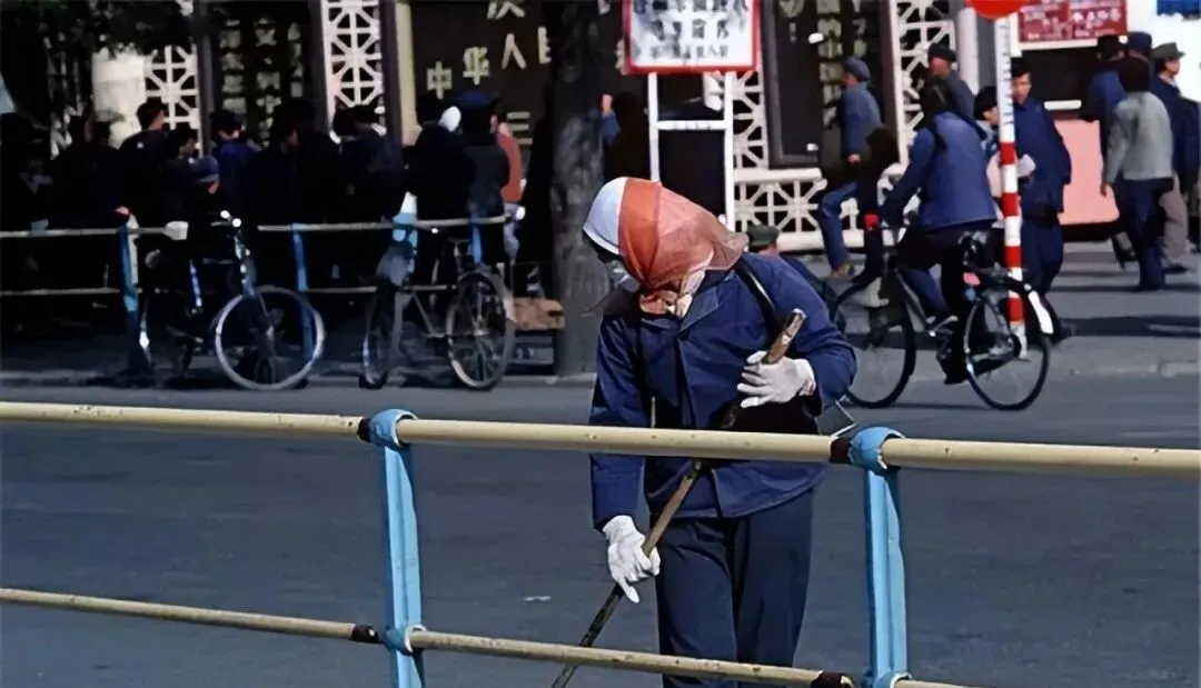 这位头上裹着三角巾,手里抓着长木把的叫清扫工,蓝灰色工作服被风鼓得鼓囊囊,手上白手套紧得发亮,刷一下又一下,铁栏上蹭出一串细响,她背后的城市慢慢亮堂起来,妈妈说以前扫一条街要半天,现在机器一过,快是快,街坊的人情味儿薄了点。
